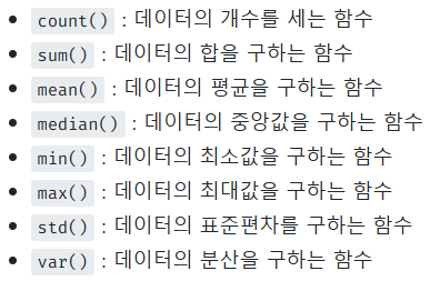describe() 함수는 데이터프레임의 요약 통계량을 출력합니다. 각 열의 개수, 평균, 표준편차, 최소값, 25% 백분위수, 중앙값, 75% 백분위수, 최대값 등의 정보를 확인할 수 있습니다.# 데이터프레임 요약 통계량 보기