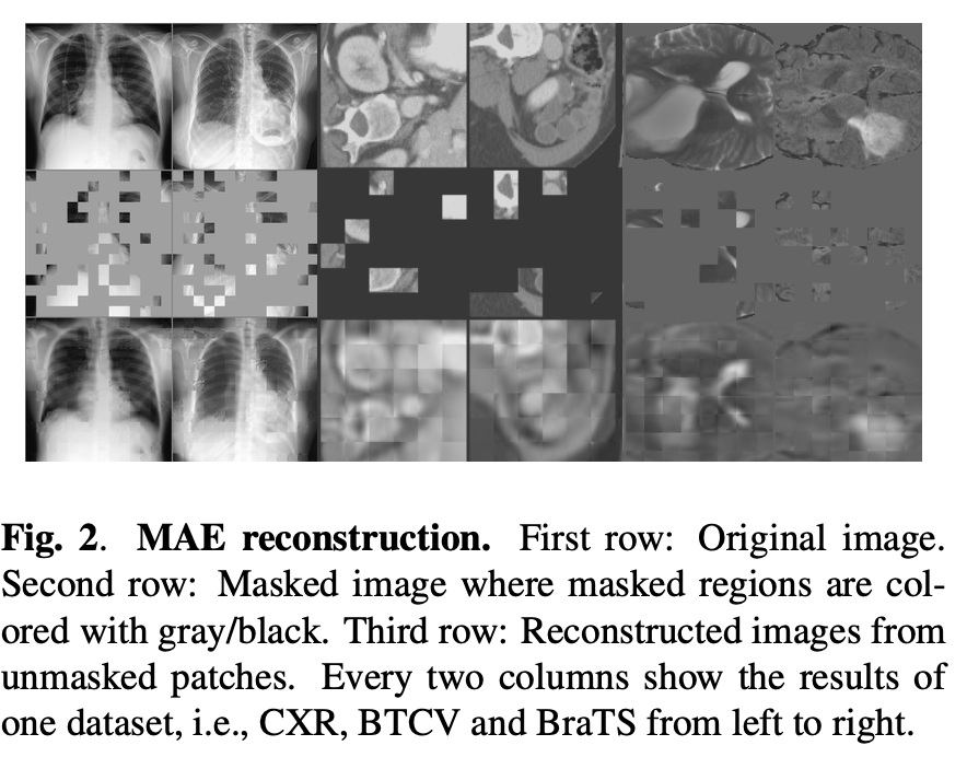 MAE 기반 self pre-training 패러다임을 의료 영상 분석에 제안 -> MAE 사전학습을 다운스트림 과제와 동일한 데이터셋의 학습(train) 세트에서 수행 = Self pre-training