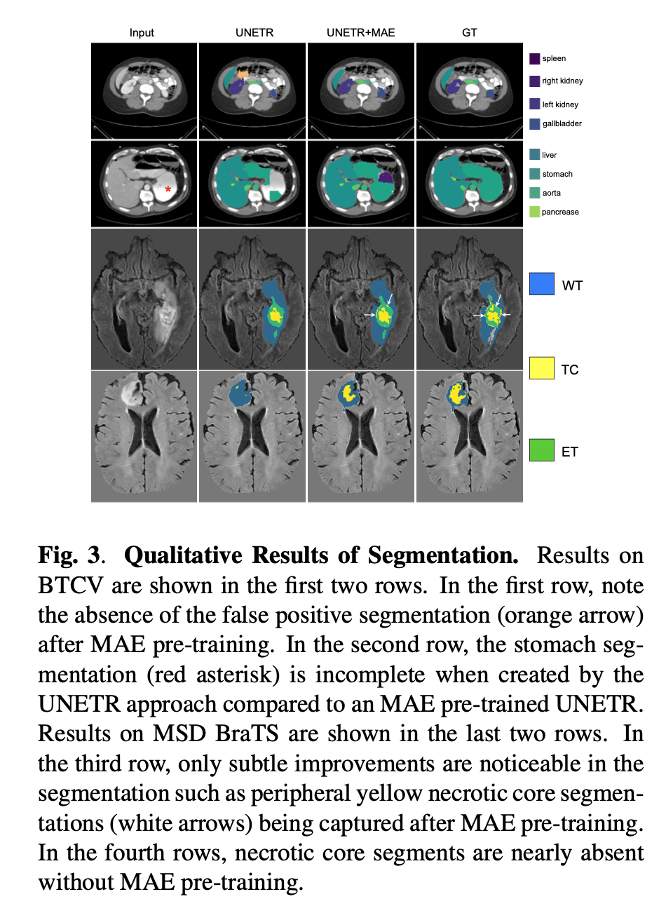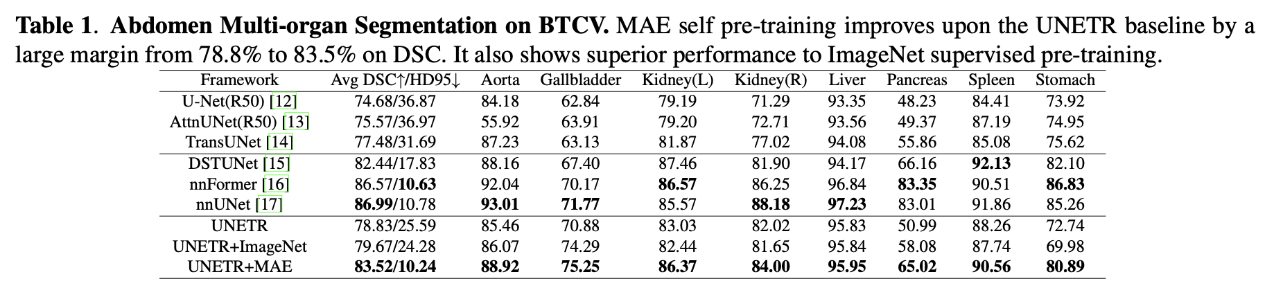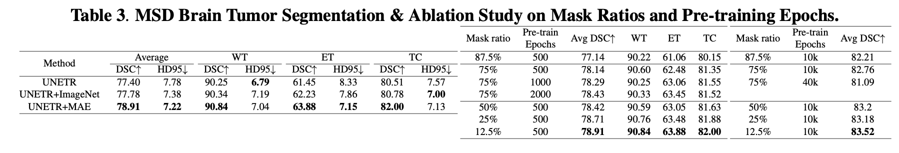 UNETR+MAE (mask=12.5%) → 78.9% / 7.22mm.