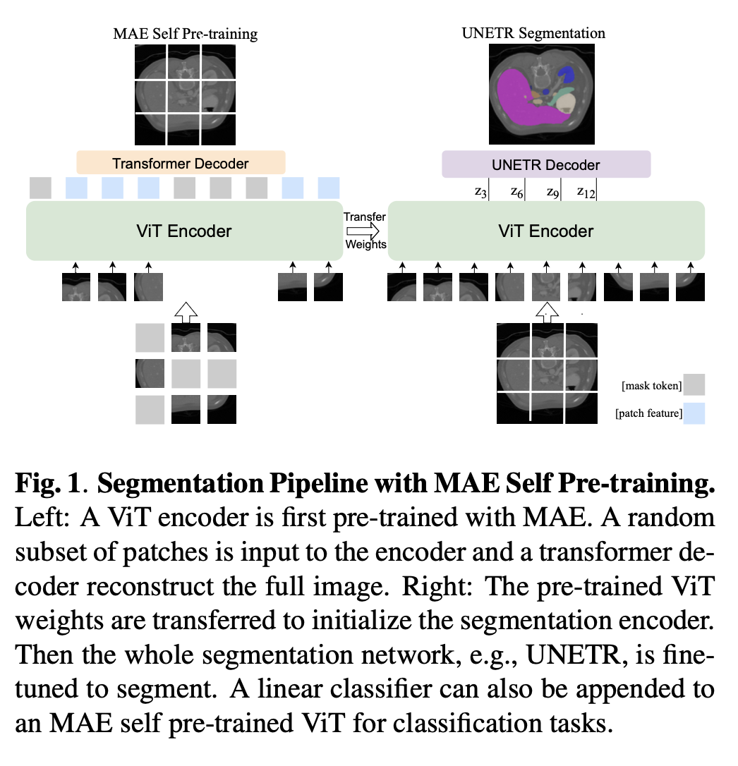 MAE 사전학습된 ViT encoder + 랜덤 초기화된 UNETR decoder.