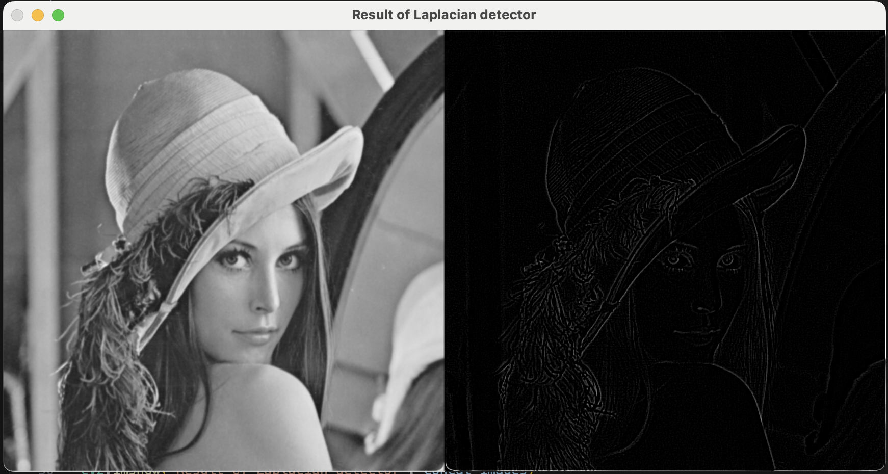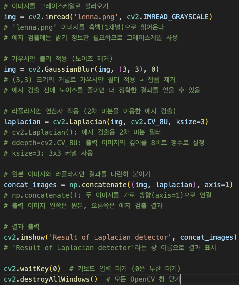 Laplacian 연산자는 2차 미분을 사용하여 밝기 변화가 급격한 경계(에지)를 검출합니다.
