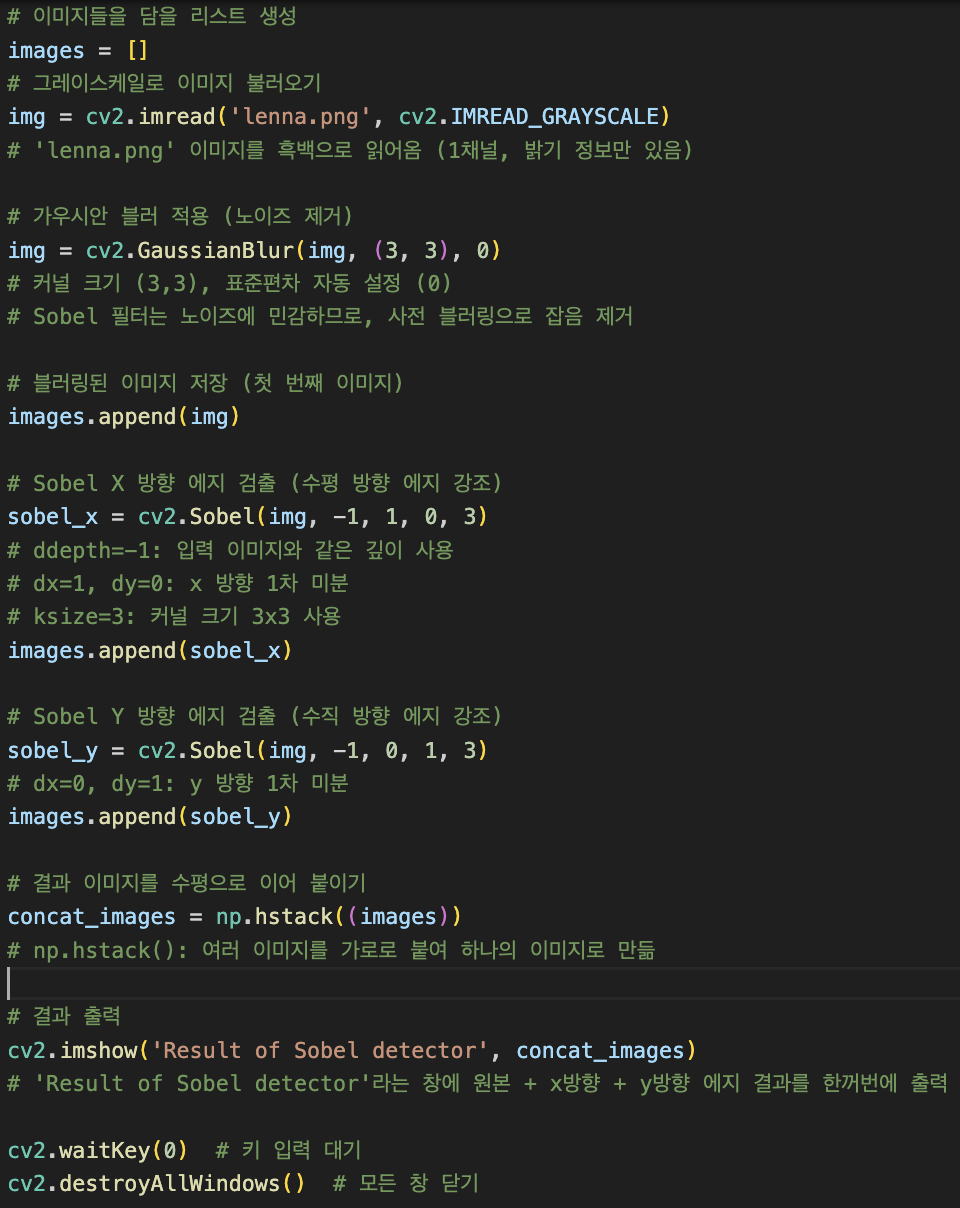 cv2.GaussianBlur()는 노이즈를 줄여 Sobel 결과의 품질을 높이는 역할을 합니다.