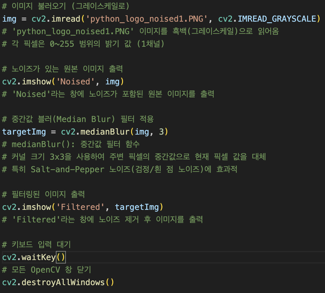 특히 점처럼 생기는 "소금-후추 노이즈(Salt-and-Pepper Noise)"에 매우 효과적입니다.