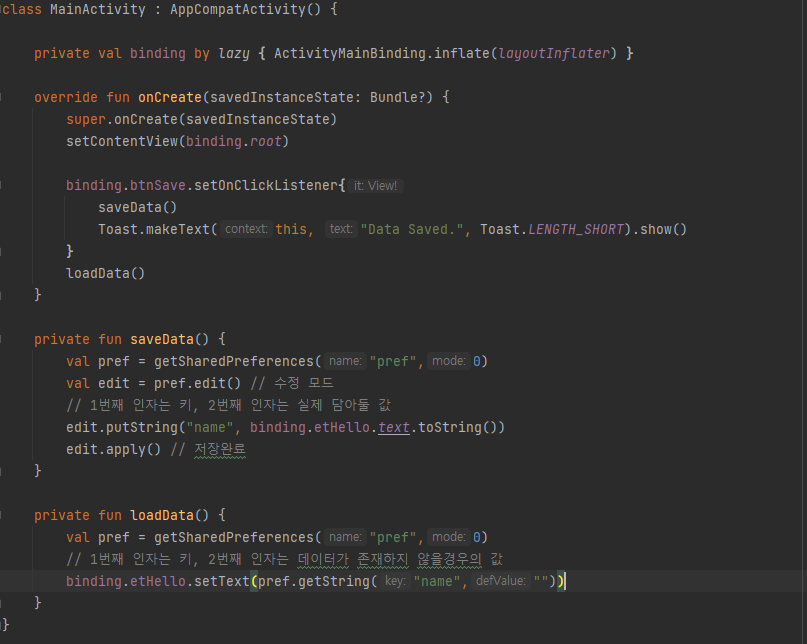 그리고 Edit 텍스트에 저장된 텍스트를 불러오기 위해 private fun loadData() 작성, val pref = getSharedPreferences("pref",0) 똑같이 작성한뒤 binding.etHello.setText(pref.getString("name",""))로 저장된 텍스트를 불러와 Edit 텍스트에 띄워준다.