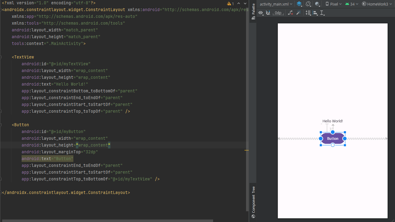 그리고 xml로 넘어가 버튼과 텍스트뷰를 만들어준다.