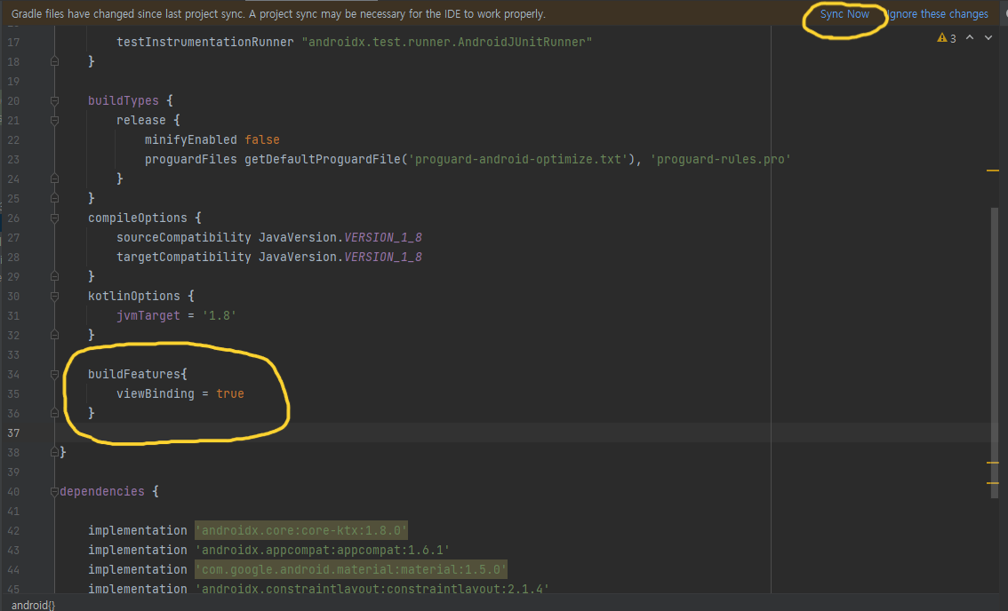 buildFeatures{viewBinding = true} 을 작성함으로써 viewBinding을 사용 할 수 있게 해주고, Sync Now를 눌러 완료해준다.