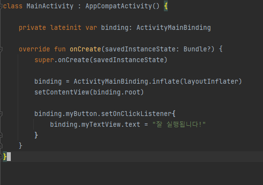 만일 View Binding이 아닌 findViewById를 썻다면 텍스트와 버튼 각각에 val 변수명 findViewById<>() 을 일일이 입력하며 사용했어야하지만