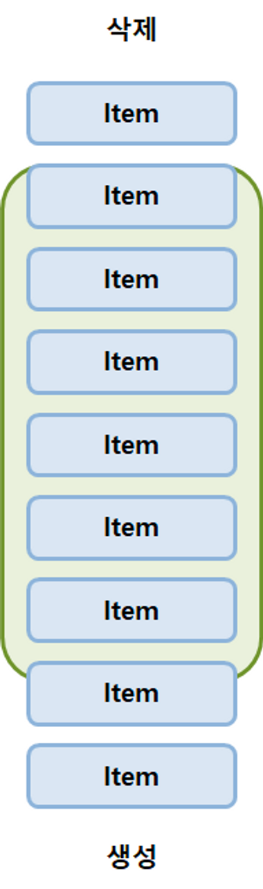 - 사용자가 스크롤 할 때마다 위에 있던 아이템은 삭제되고, 맨 아래의 아이템은 생성 되길 반복합니다
