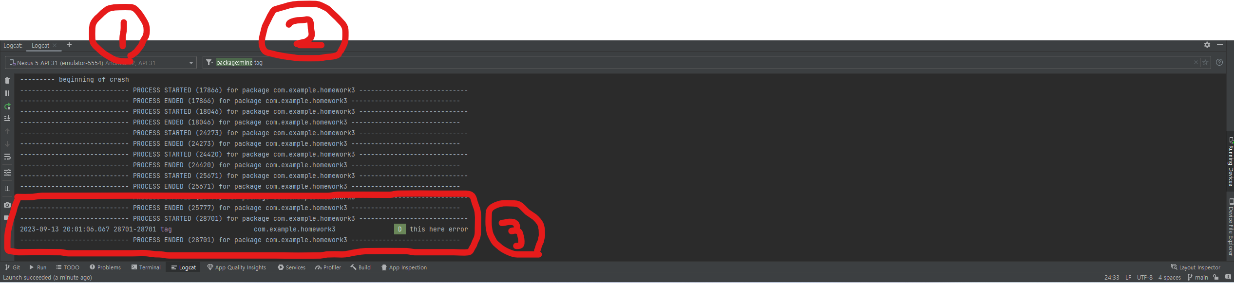 3번을 또 보면 제대로 로그가 나오는걸 볼 수 있다. Log.d("tag", "this here error") 라고 적은대로 tag가 나오고 마지막에 this here error라고 잘 출력된걸 볼 수있다.