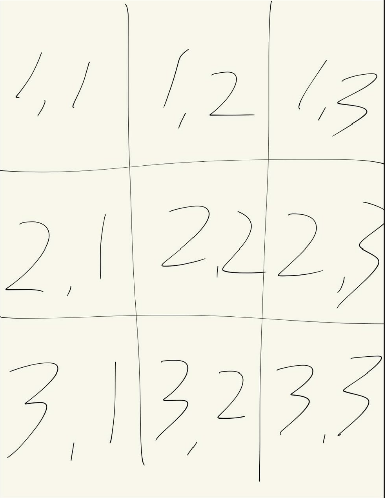 (3,3)의 누적합은 (1,1) (1,2) (1,3) (2,1) (2,2) (2,3) (3,1) (3,2) (3,3)입니다.