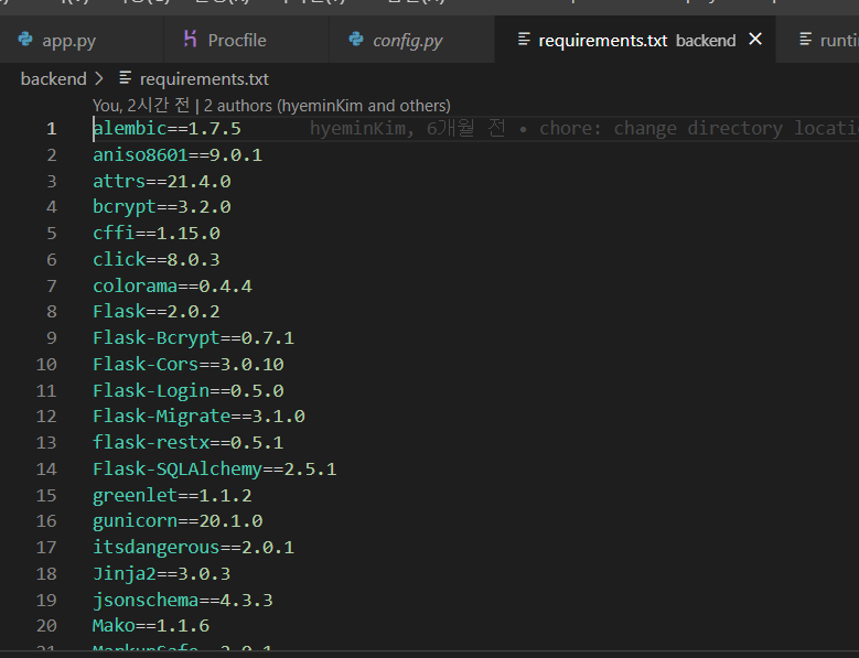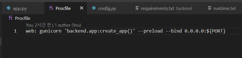 source .project012/Scripts/activatesource 내가_만든_가상환경_이름/Scripts/activate pip install gunicorn pip install psycopg2-binarygit checkout -b temp-deploy → 잘 안될까봐 temp-deploy로 ㅎㅎProcfile 만들기. (주의: P는 대문자임!!!!!!!!) web: gunicorn 'backend.app:create_app()' --preload --bind 0.0.0.0:${PORT}