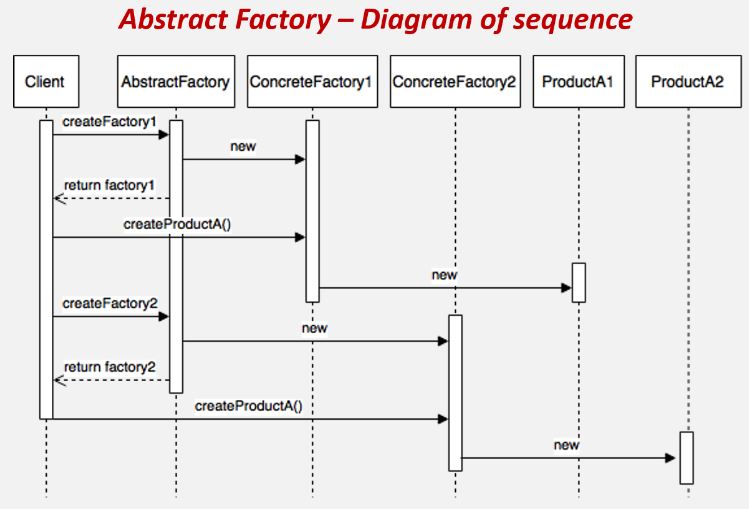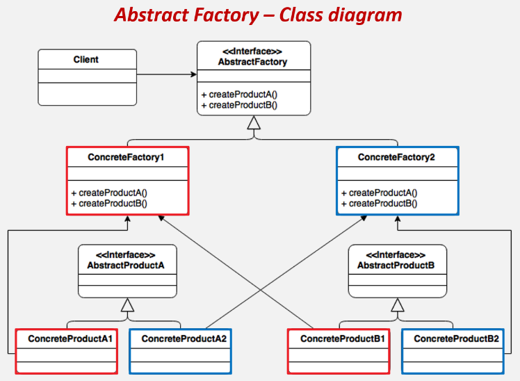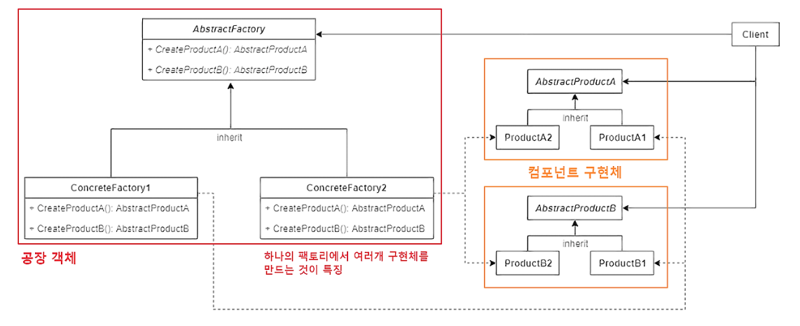 AbstractFactory : 최상위 공장 클래스. 여러개의 제품들을 생성하는 여러 메소드들을 추상화 한다.ConcreteFactory : 서브 공장 클래스들은 타입에 맞는 제품 객체를 반환하도록 메소드들을 재정의한다.AbstractProduct : 각 타입의 제품들을 추상화한 인터페이스ConcreteProduct (ProductA ~ ProductB) : 각 타입의 제품 구현체들. 이들은 팩토리 객체로부터 생성된다. Client : Client는 추상화된 인터페이스만을 이용하여 제품을 받기 때문에, 구체적인 제품, 공장에 대해서는 모른다.