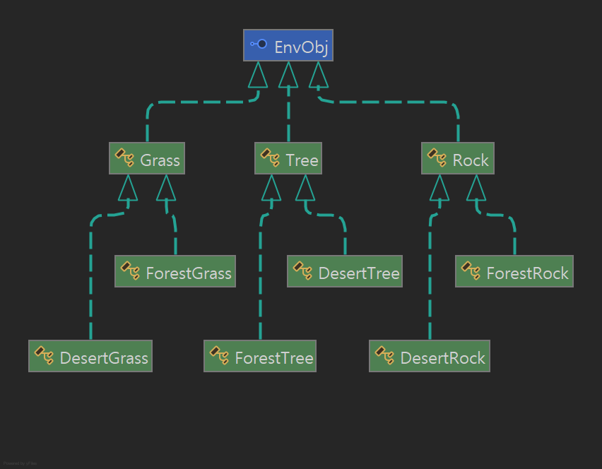 실제 게임에서 있을듯한 상황을 가정해보자. 특정 맵에서 맵에 환경 오브젝트를 추가하는 로직을 구현한다고 하자. 나무(Tree), 바위(Rock), 풀(Grass)를 각각 맵에 잘 배치되기 위해 각기 객체로 지정한다. 그런데 맵 종류가 숲(Forest)와 사막(Desert)으로 종류가 나뉘는데 어떤 종류냐에 따라 생성될 환경 오브젝트의 모습이 달라질 수 있기 때문에 각기 생성하여 구현하고자 한다.