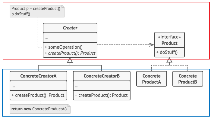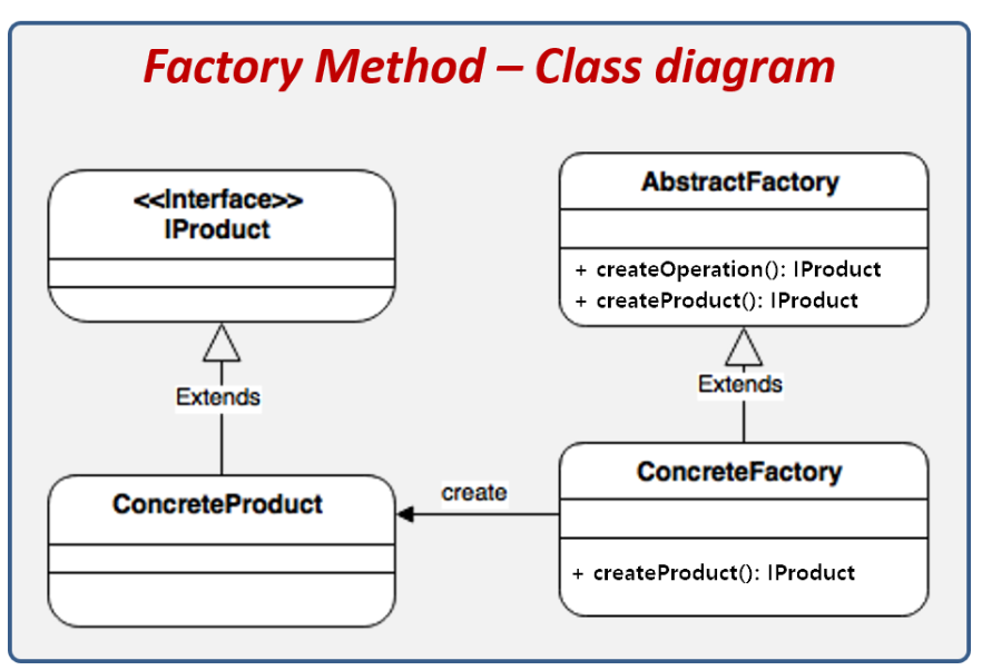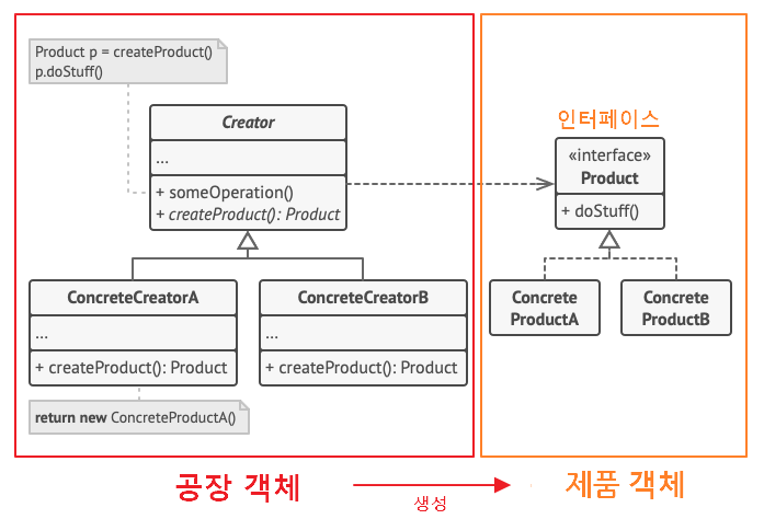 Creator : 최상위 공장 클래스로서, 팩토리 메서드를 추상화하여 서브 클래스로 하여금 구현하도로 함ConcreteCreator : 각 서브 공장 클래스들은 이에 맞는 객체를 반환하도록 생성 추상 메소드를 재정의한다. 즉, 객체 하나당 그에 걸맞는 생산 공장 객체가 위치된다.Product : 객체 구현체를 추상화ConcreteProduct : 객체 구현체요약하자면, 팩토리 메서드 패턴은 객체를 만들어내는 공장(공장도 객체)을 만드는 패턴이다. 어떤 클래스의 인스턴스를 만들지는 미리 정의한 공장 서브 클래스에서 결정한다. 객체 생성을 이러한 과정을 통해 구현하는 이유는 객체 간의 결합도를 낮추고 유지보수에 용이해지기 때문이다.