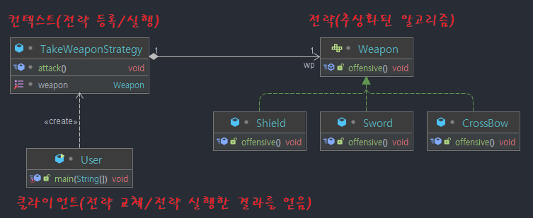 클린하지 않는 기존의 코드에서는 메서드에 상수값을 넘겨주었지만, 전략 패턴에선 인스턴스를 넣어 알고리즘을 수행하도록 한 것이다. 이런식으로 구성하면 좋은 점은 나중에 칼이나 방패외에 도끼나 창과 같은 무기들을 추가로 등록할 때, 코드의 수정없이 빠르게 기능을 확장할 수 있다.