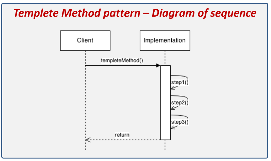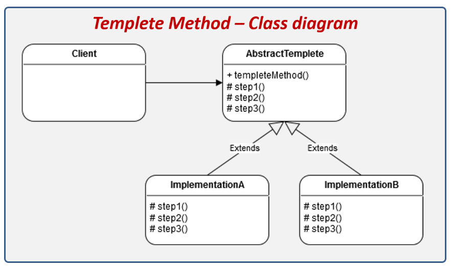 템플릿 메서드 (Template Method) 패턴은 여러 클래스에서 공통으로 사용하는 메서드를 템플릿화 하여 상위 클래스에서 정의하고, 하위 클래스마다 세부 동작 사항을 다르게 구현하는 패턴이다. 변하지 않는 기능(템플릿)는 상위 클래스에 구현하고 자주 변경되며 확장할 기능은 하위 클래스에서 만들도록 하여, 상위의 메소드 실행 동작 순서는 고정하면서 세부 실행 내용은 다양화 될 수 있는 경우에 사용된다.