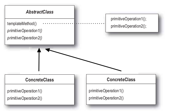 AbstractClass(추상 클래스) : 템플릿 메소드를 구현하고, 템플릿 메소드에서 돌아가는 추상 메소드를 선언한다. 이 추상 메소드는 하위 클래스인 ConcreteClass 역할에 의해 구현된다.ConcreteClass(구현 클래스) : Abstract Class를 상속하고 추상 메소드를 구체적으로 구현한다. ConcreteClass에서 구현한 메소드는 AbstractClass의 템플릿 메소드에서 호출된다.