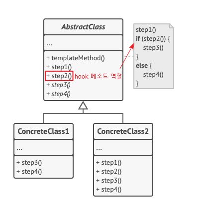 훅(hook) 메서드는 부모의 템플릿 메서드의 영향이나 순서를 제어하고 싶을때 사용되는 메서드 형태를 말한다. 위의 그림에서 보듯이 템플릿 메서드 내에 실행되는 동작을 step2() 이라는 메서드의 참, 거짓 유무에 따라 다음 스텝을 어떻게 이어나갈지 지정한다. 이를 통해 자식 클래스에서 좀더 유연하게 템플릿 메서드의 알고리즘 로직을 다양화 할 수 있다는 특징이 있다.