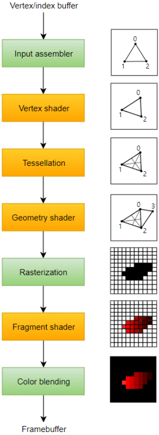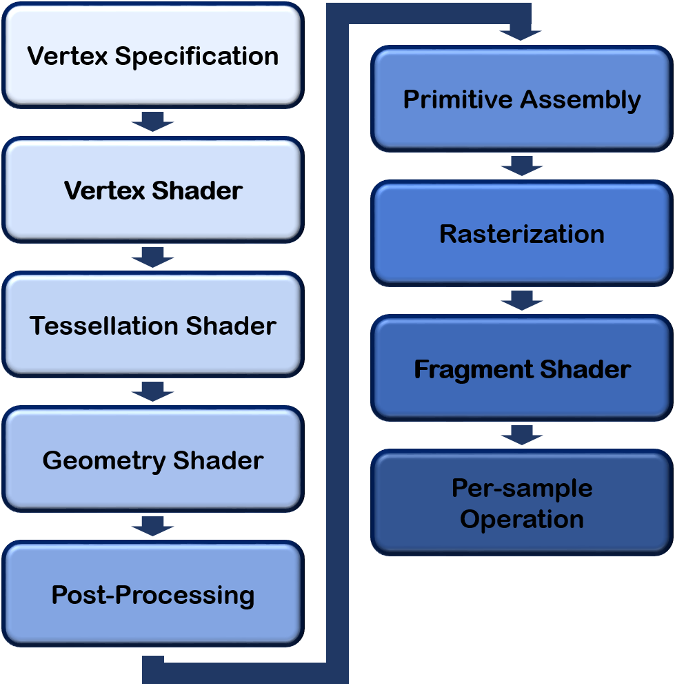 • Four stages are programmable via shaders (Vertex, Tessellation, Geometry, Fragment).