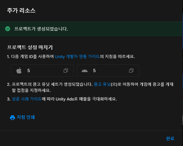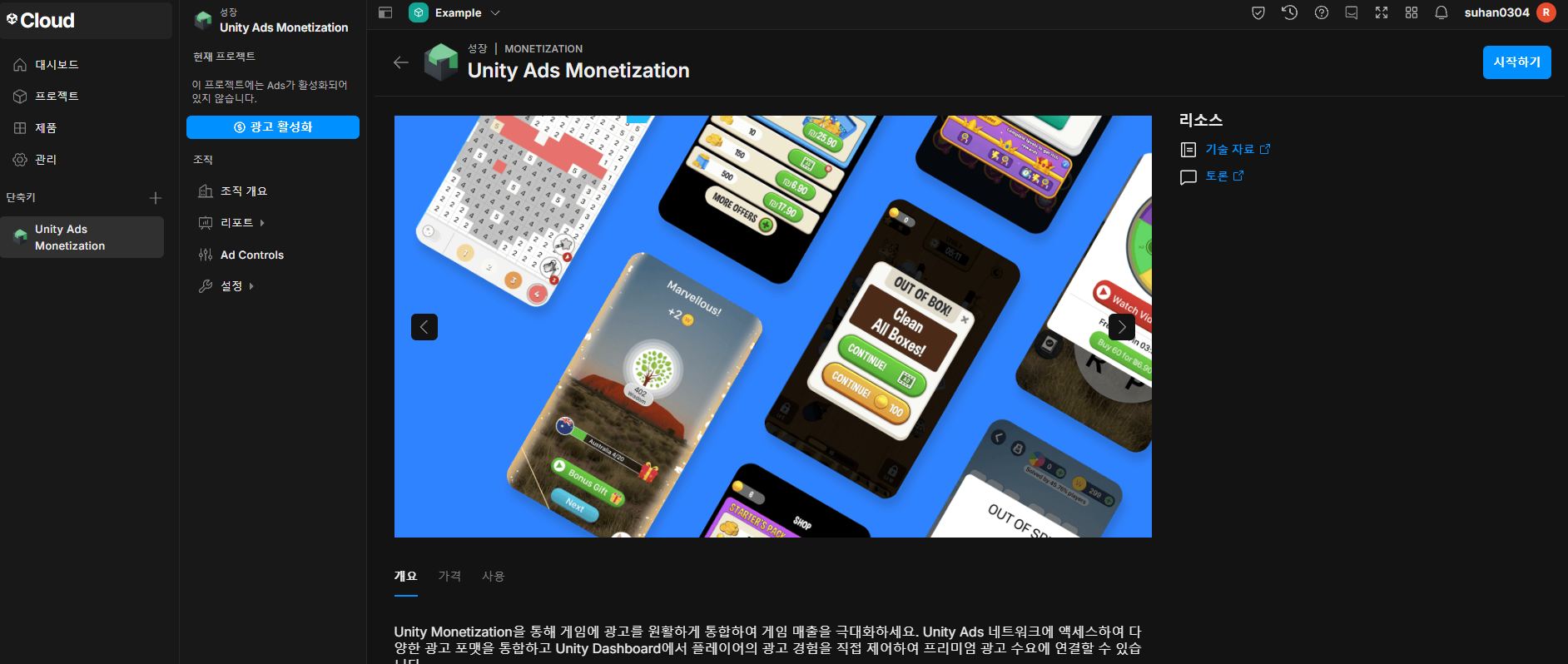 AdsManager에 필요한 ID는 유니티 클라우드에서 광고 활성화를 해야 가져올 수 있다.
