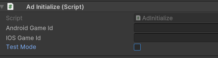 AdsManager 오브젝트를 만들고 아래 AdsInitialize 스크립트를 붙이면 아래와 같이 나타난다.