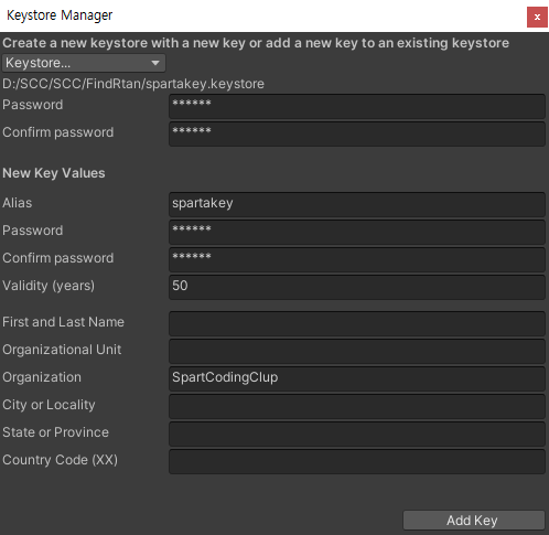 이 때 설정하는 비밀번호는 절대로 잊어버리면 안되기 때문에 어딘가에 메모를 해두는게 좋다. 이 키스토어 파일과 비밀번호는 무조건 백업을 해두는게 좋다. 이 둘 중 하나라도 잃어버리면 스토에 올린 프로젝트를 수정하지 못하는 사태가 발생할 수도 있다.