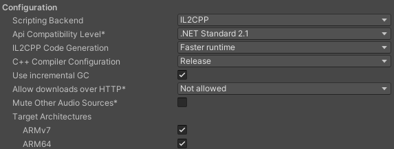 제일 중요한 건데 안드로이드 마켓에 배포하려면 64bit 지원이 필수여야 하기 때문에 IL2CPP로 바꿔주고 Target Architectures의 ARM64에도 체크를 해주어야한다.