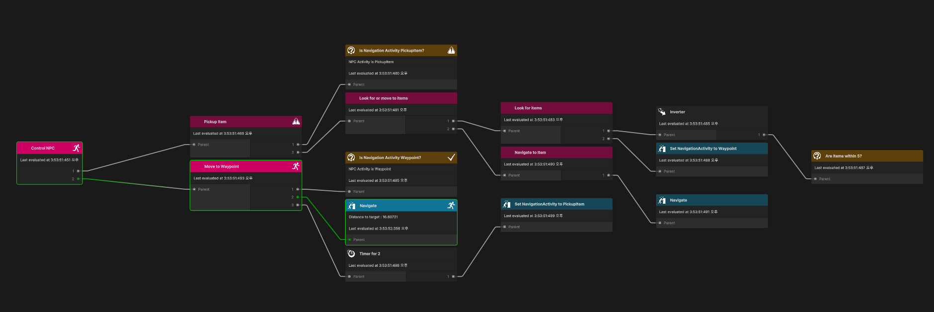 간단히 설명하자면, 노드가 처음 실행될 때, NPC의 현재 NavigationActivity에 따라 대상 목적지를 묻는다. 가장 가까운 아이템 위치 또는 다음 웨이포인트 위치를 반환한다. 반환된 위치는 NavMeshAgent가 사용하여 경로를 탐색하는데 사용한다. 이렇게 하면 경로를 찾을 수 없는 포지션이 NavMesh에 전달되는 것을 방지할 수 있다. 마지막으로 노드는 NodeStatus.Running을 반환한다.