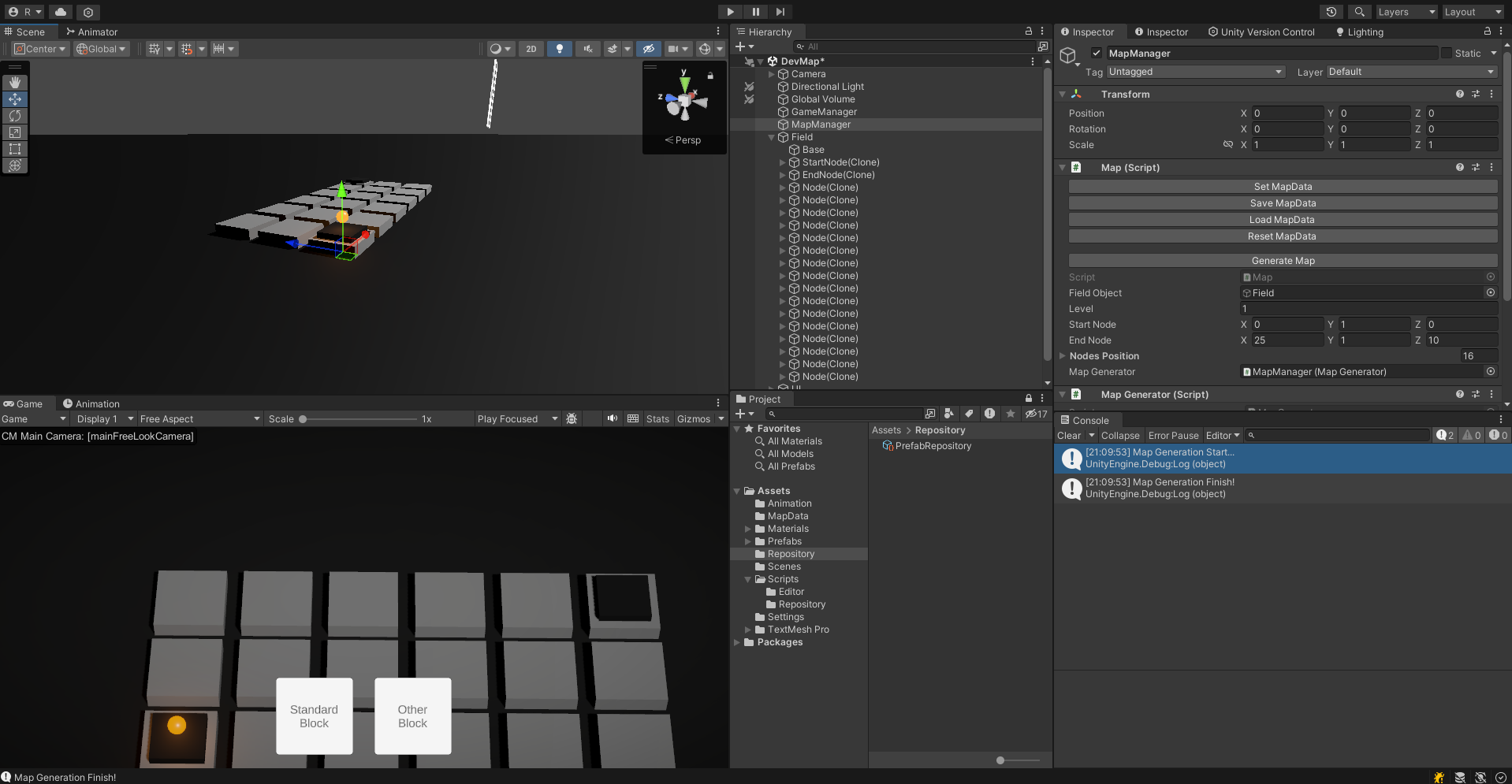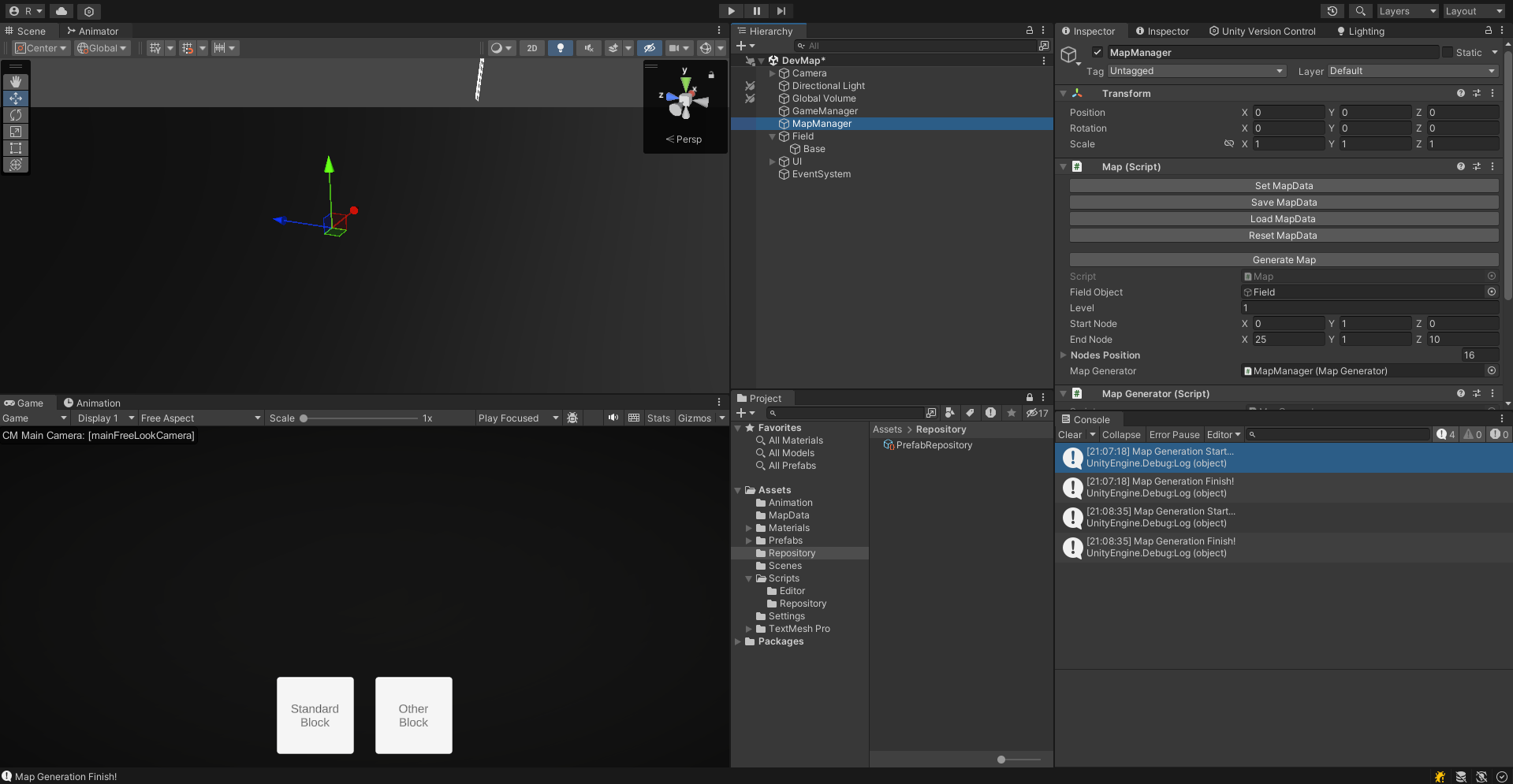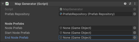 중요한 점은 MapGenerator는 Prefab을 가지고 있어야 쓸 수 있다. 게임 매니저가 모든 프리팹을 가지고 있기보다는 Prefab Repository를 하나 작성해준다. Repository를 통해 스크립트의 프리팹을 초기화하도록 해준다.