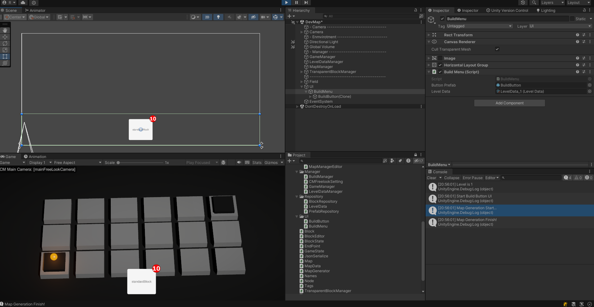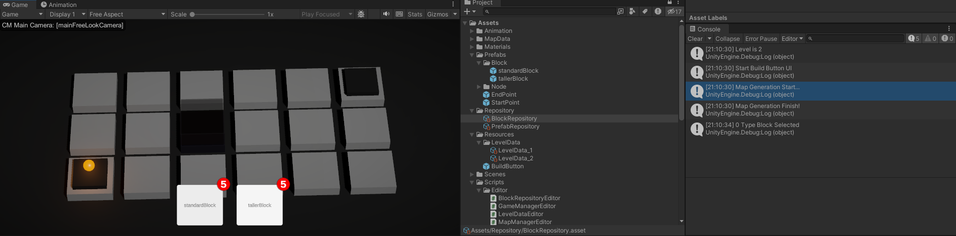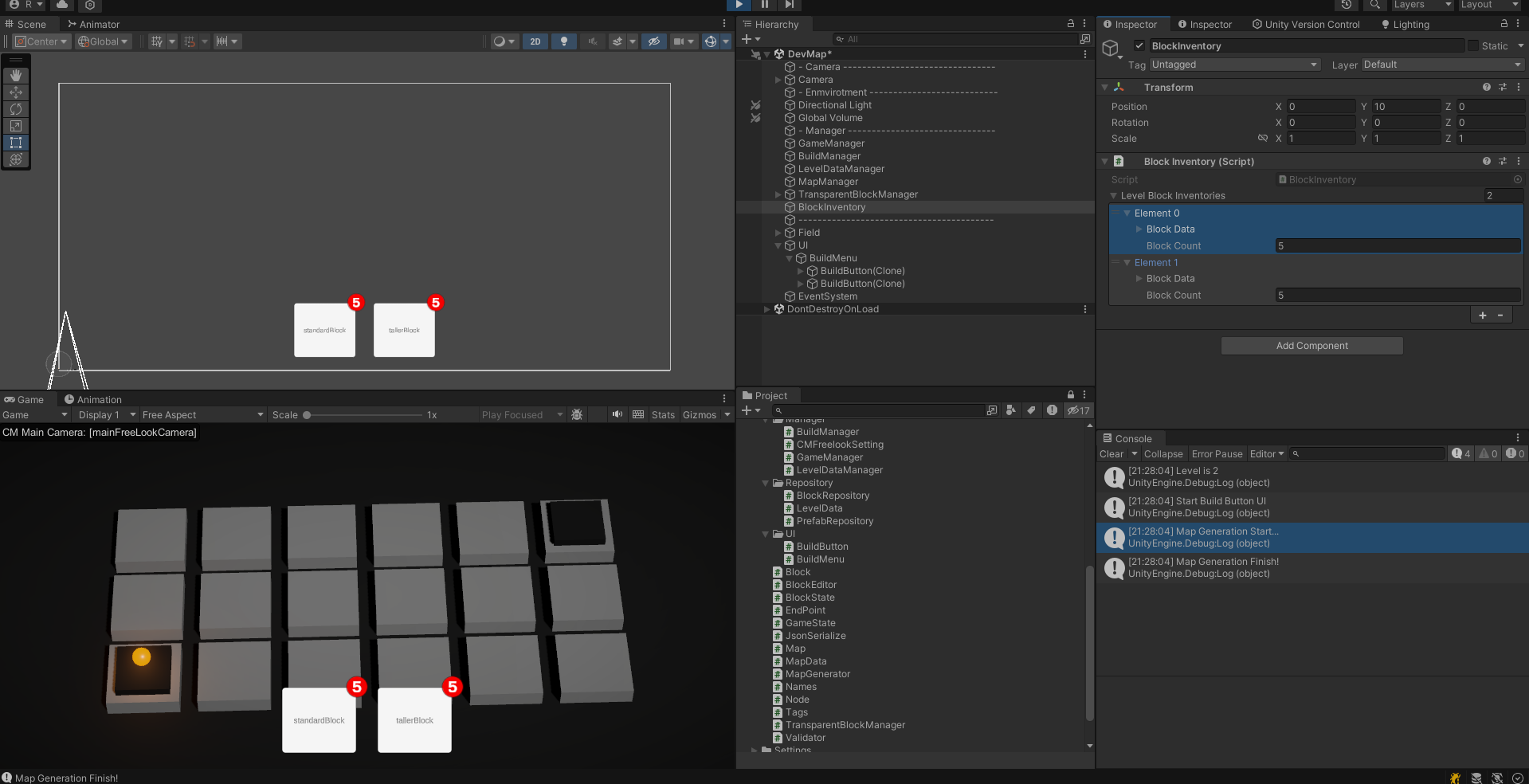 이제 레벨에 따라 LevelData를 불러오고 LevelData에 있는 block Inventory를 기반으로 하단 UI 버튼이 생성된다.