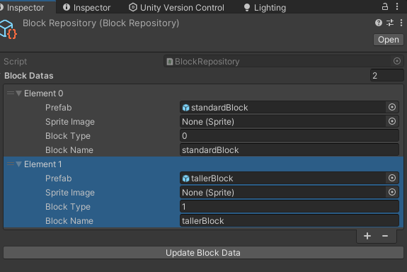 혹시 몰라서 블럭 데이터를 자동으로 업데이트 하는 버튼을 만들어줬다. 프리팹을 넣으면 자동으로 이름이랑 타입이 업데이트 된다. 이미지는 나중에 Resources에 블럭과 동일한 이름의 Sprite로 넣어서 Load 하도록 업데이트 할 예정이다.