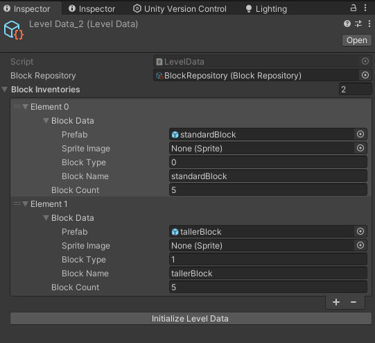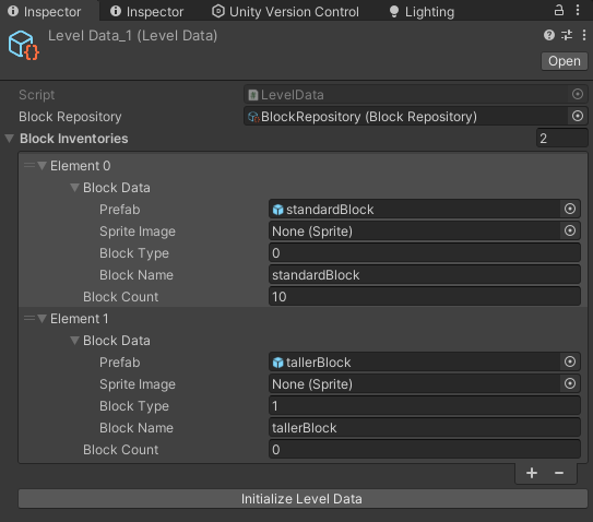 Block Inventory를 구현해보자. Block Inventory는 일단 먼저 Block Repository의 모든 block들을 가져온 다음 수량을 지정해주도록 할 예정이다. 이게 block Inventory보다는 LevelData로 이름을 짓는게 자연스러울 거 같아서 levelData로 작성했다.
