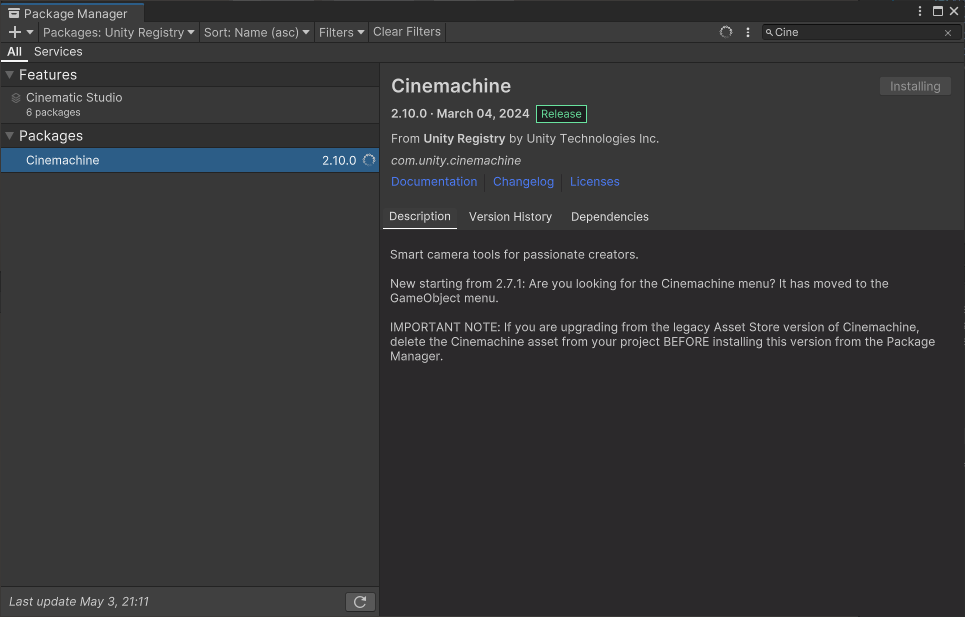 일단 가장 먼저 시네머신을 사용해서 추후에 필요한 여러 카메라의 기능적 동작들을 쉽게 사용할 수 있도록 하는 것이 좋을 것 같아서 프로젝트에 시네머신을 import해서 설정해주었다.