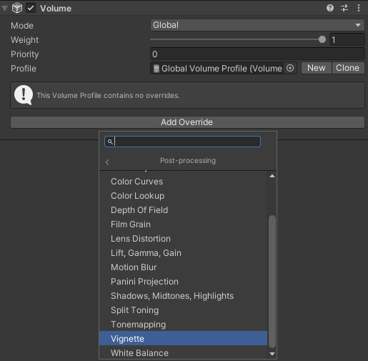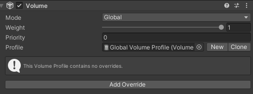 Gloval Volume 오브젝트로 효과를 줄 수 있다. (없으면 Volume > Global Volume을 하나 생성해준다. ) Volume 컴포넌트의 Profile New 버튼을 눌러 새로운 프로파일 에셋을 적용한다.