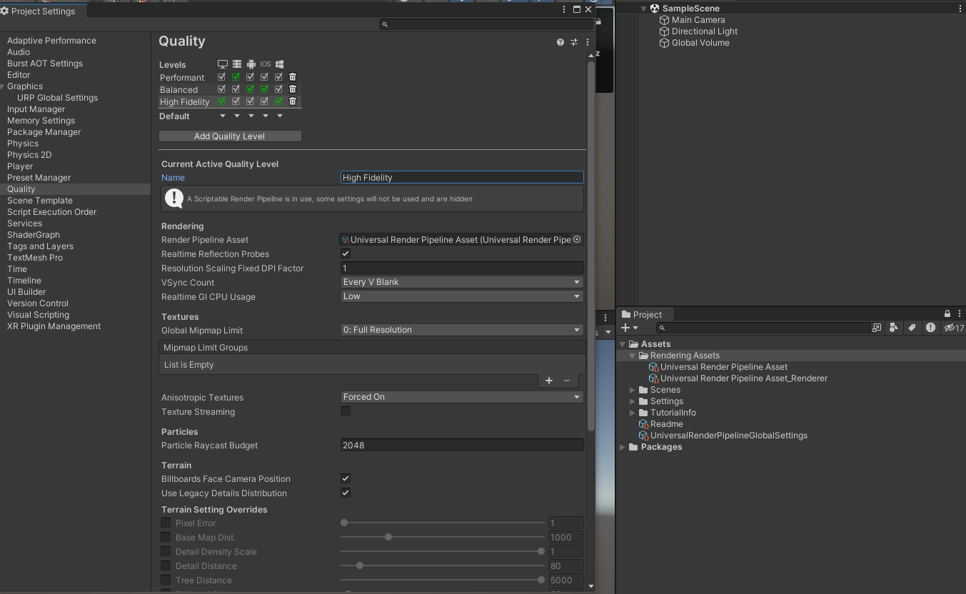 Project Settings > Quality 섹션을 High로 선택한다. (렌더링 품지을 설정하는 옵션으로 구동 디바이스의 성능에 따라서 적절히 선택한다.) 중간 부분에 있는 Rendering 속성에 UniversalRenderPipelineAsset 에셋을 연결한다.