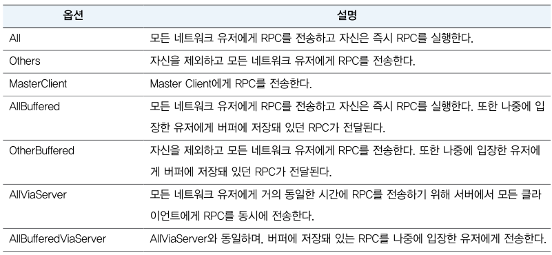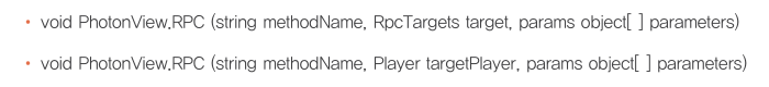 PhotonView.RPC(호출할 함수명, 호출 대상, 전달할 데이터)