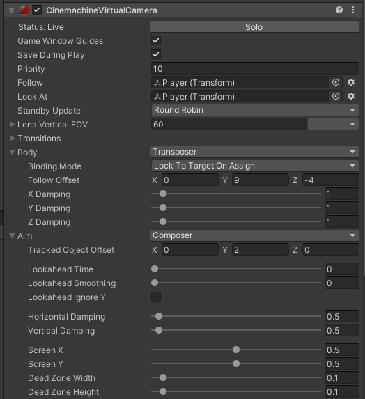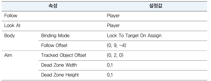 Follow와 LookAt에 Player를 연결해주고 아래 표를 참고해 속성값을 설정한다.