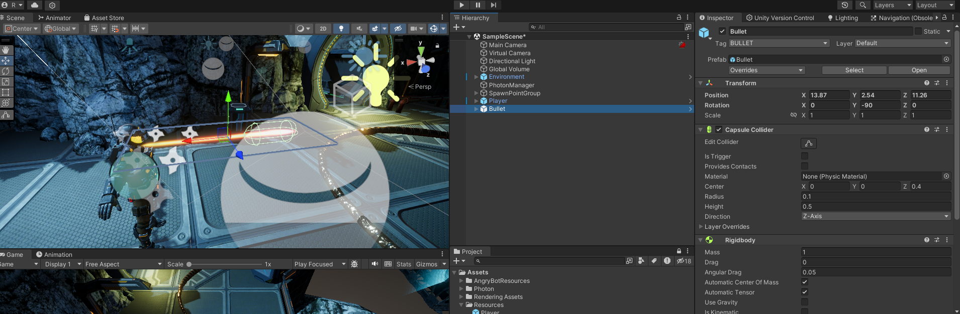 총알 프리팹에 PhotonView 컴포넌트를 추가해 생성하면 구현할 수 있지만 괴장히 잘못된 방법. Photon View 컴포넌트는 초당 20회 데이터를 전송하기 때문에 스테이지에 많은 총알이 생성하면 생성된 모든 총알에서 데이터 트래픽 발생하고 네트워크 대역폭을 초과한다!