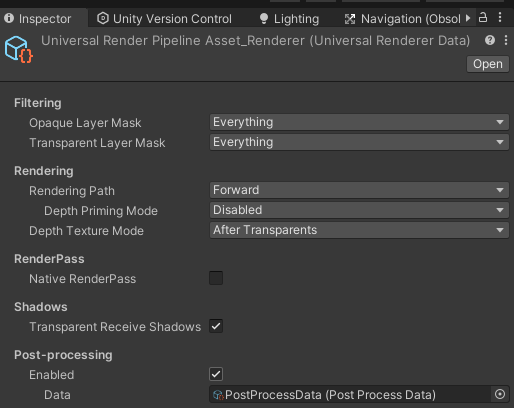 Universal RP를 사용하면 포스트 프로세싱 패키지를 따로 설치할 필요없이 같이 사용할 수 있다. 포스트 프로세싱을 사용하려면 프로젝트 뷰에서 URP Asset을 생성할 때 같이 생성된 Renderer 에셋을 선택하고 Post-Processing 섹션의 Enabled 옵션을 체크한다. 자동으로 PostProcessData 에셋이 연결된다.