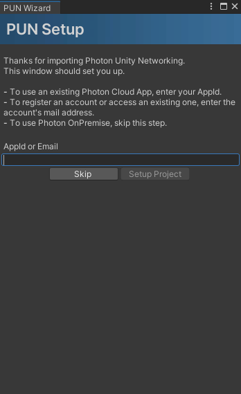 PUN Wizard? Window > Photon Unity Networking > PUN Wizard를 선택해 열 수 있다.