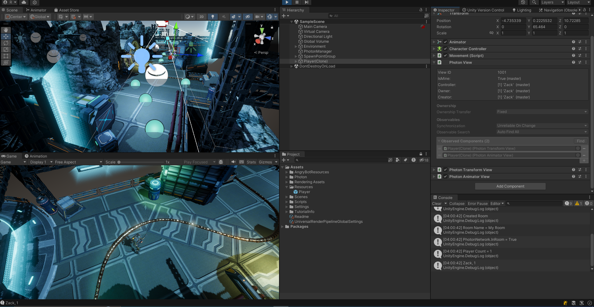 당연히 포톤 서버에 연결되고 룸을 생성한 후에 입장한 상태가 된다. 이제 유니티로 실행하면 랜덤 매치 메이킹 기능 때문에 동일한 룸에 입장하게 되며 두번째로 접속한 유저가된다. 서로 이동하는지 확인해볼 수 있다.