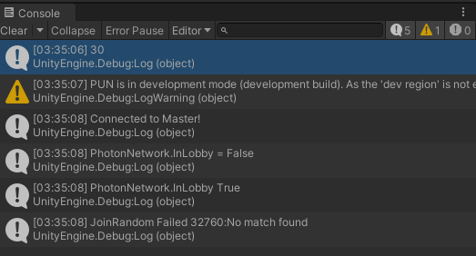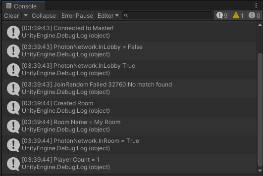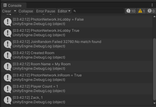 룸이 생성되고 InRoom 속성이 True가 됐다. Room에는 방장인 나밖에 없으므로 PlayerCount = 1이다.