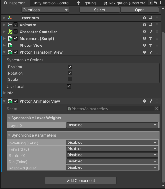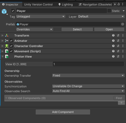 플레이어를 선택하고 PhotonView 컴포넌트를 추가한다.