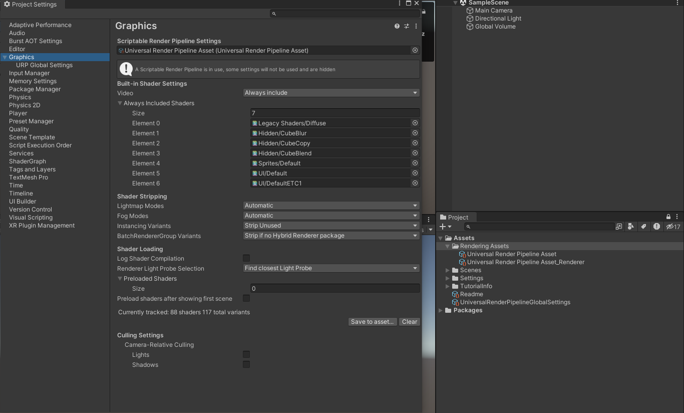 Edit > Project Settings > Graphics에서 Scriptable Render Pipeline Settings 속성을 앞에 생성한 UniversalRenderPipelineAsset 에셋을 드래그해 연결해준다.