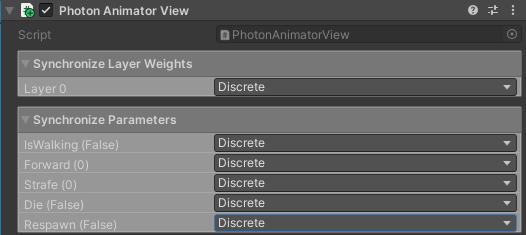 Photon Animator View는 자동으로 Animator 컴포넌트의 정보를 읽어와 자동으로 Layer와 Parameter 값을 설정한다. 다만 동기화 속도를 설정해줘야 한다. 네트워크 대역폭과 동기화의 정확성을 고려해 Discrete(이산)와 Continues(연속) 중 하나를 택한다.