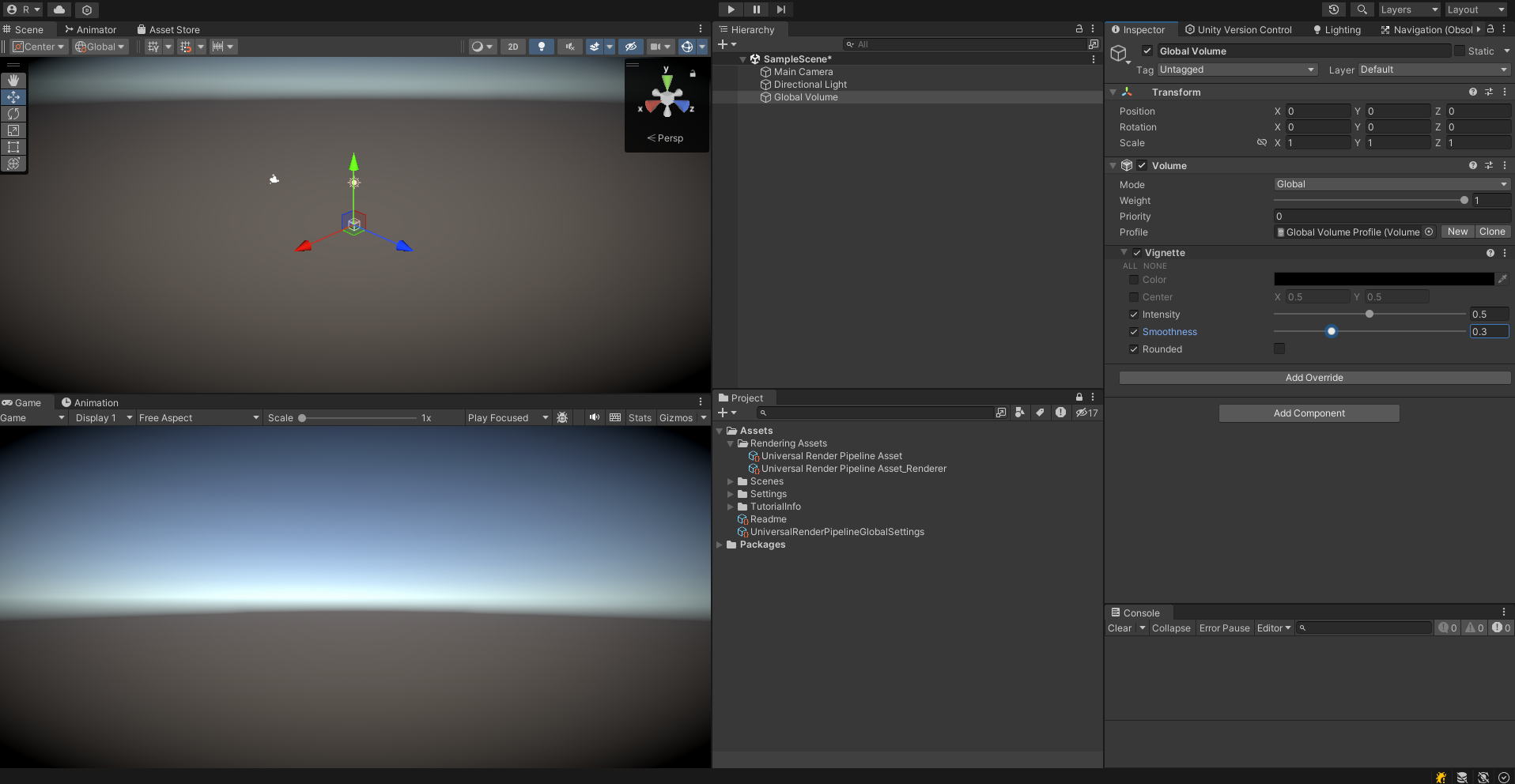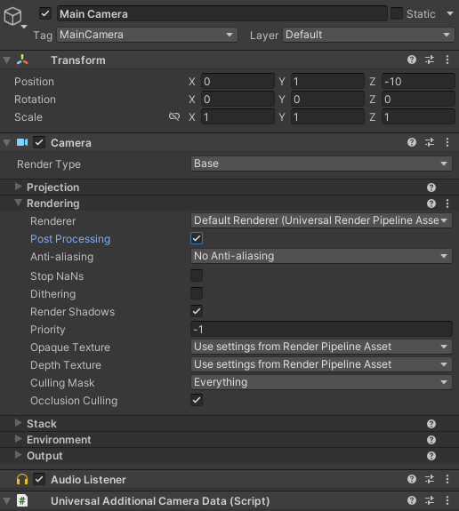 Main Camera 를 선택한 후 인스펙터 뷰에서 Rendering > Post Processing 옵션을 체크해야 게임 뷰에서도 비네팅이 표현된다.
