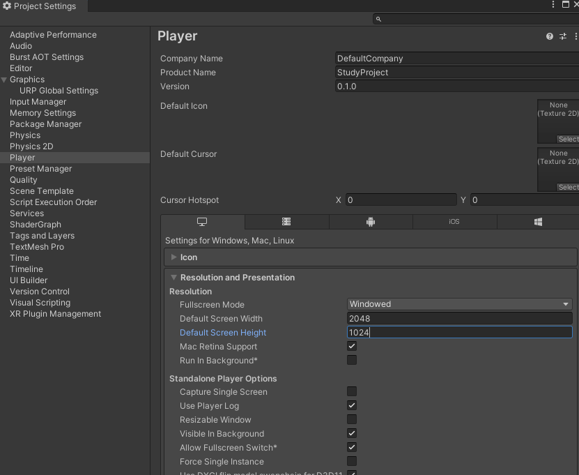 Edit > Project Settings를 선택해 Player 섹션을 선택