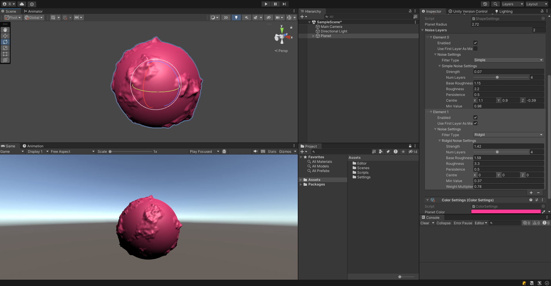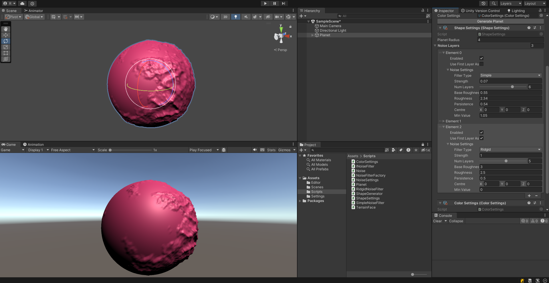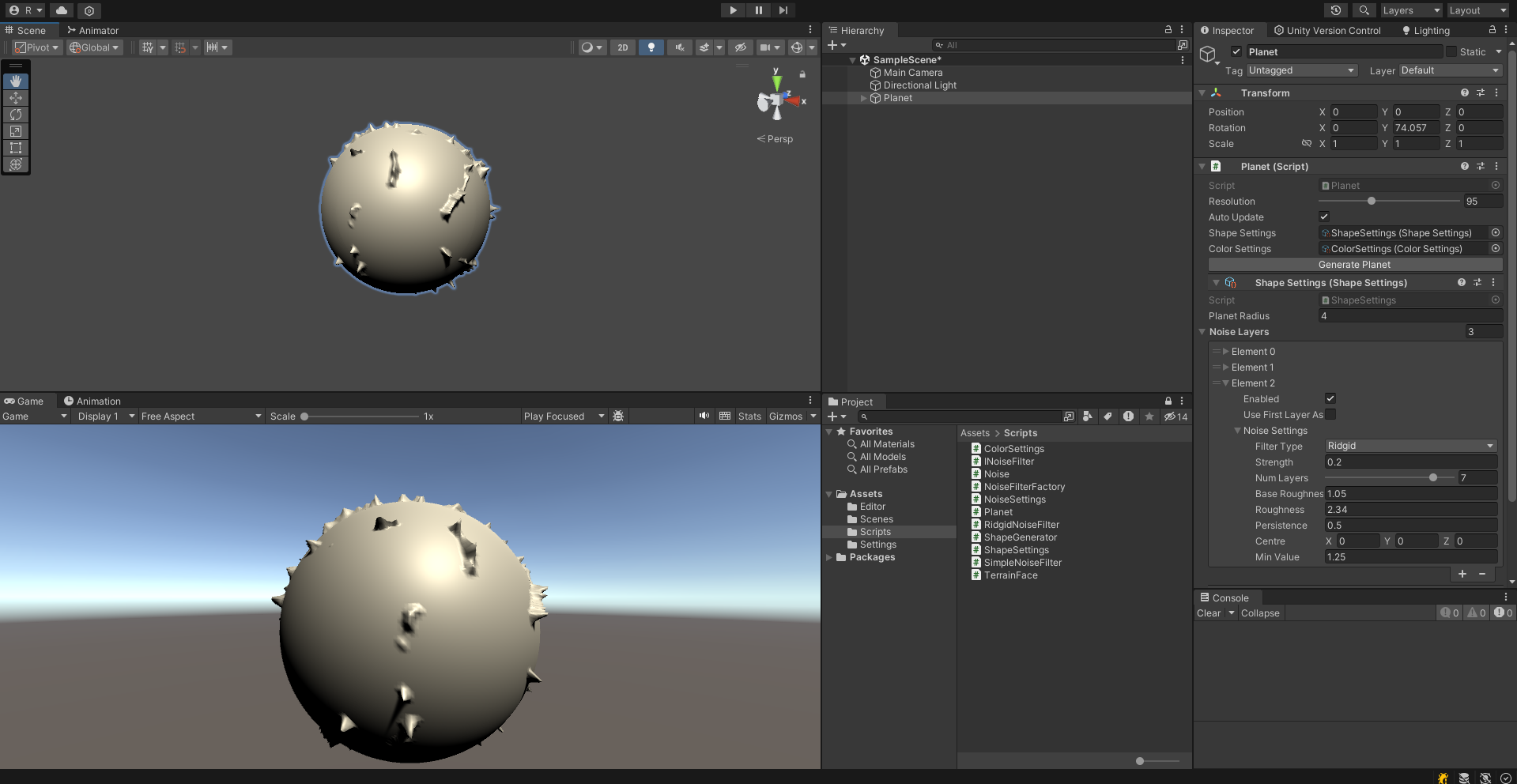 이제 적절하게 값을 조절해서 산맥이 있는 대륙이 만들어진 행성을 아래와 같이 구현할 수 있다.
