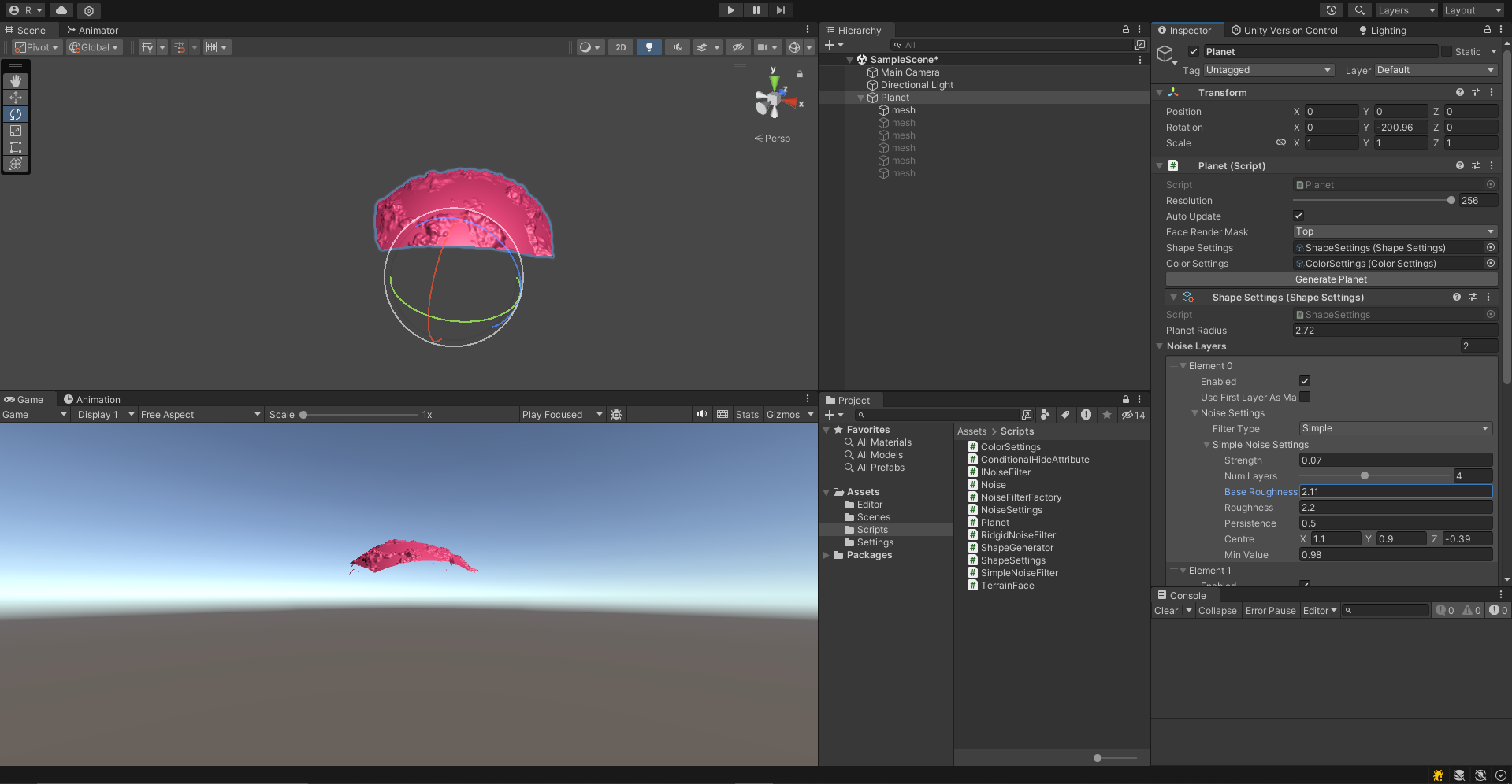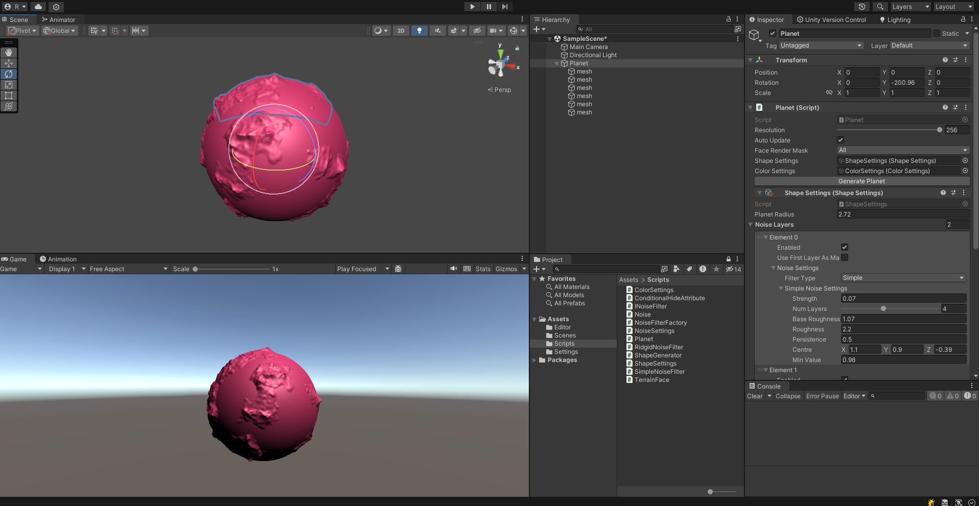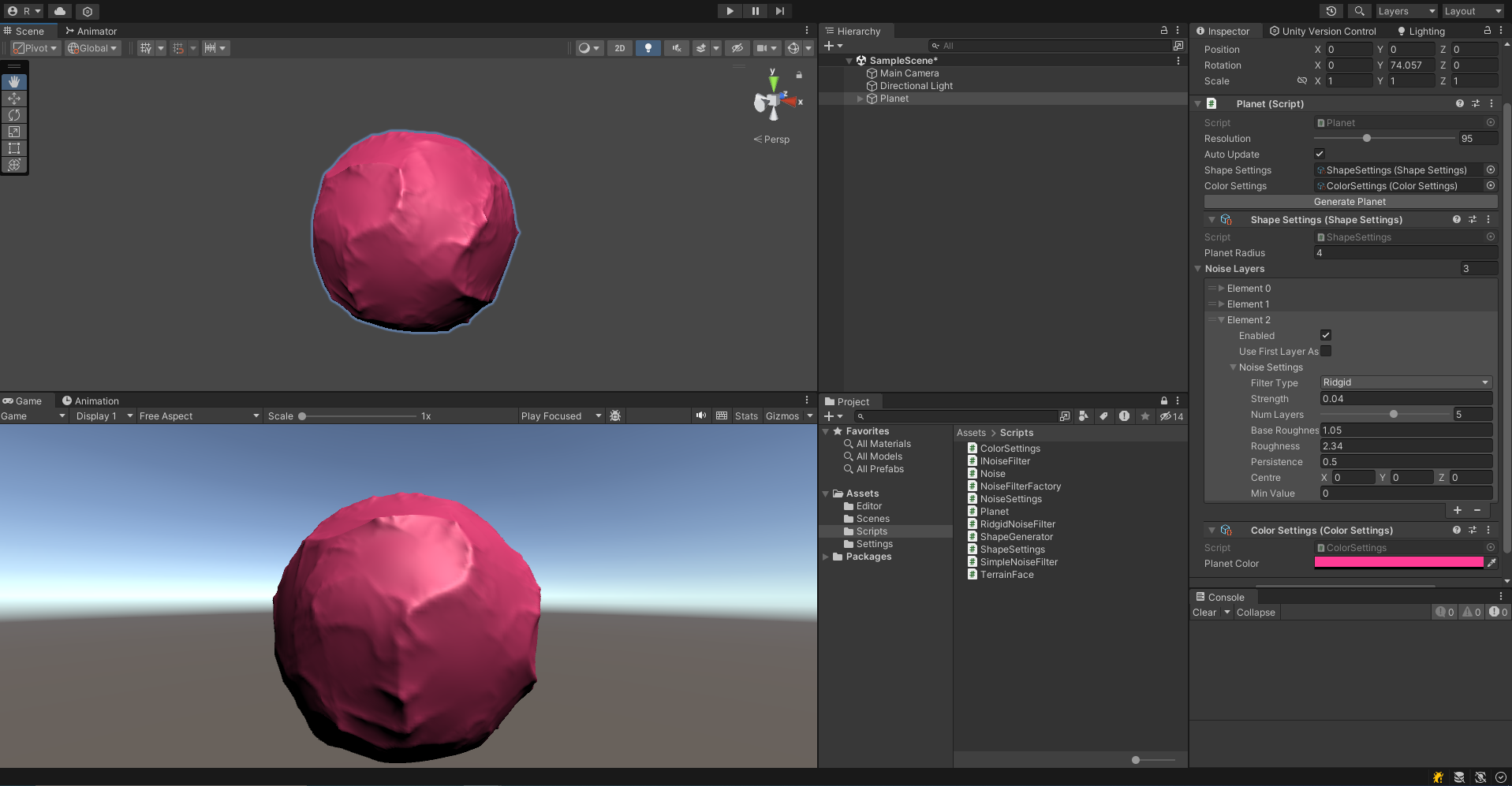 이제 적절하게 값을 조절해서 산맥이 있는 대륙이 만들어진 행성을 아래와 같이 구현할 수 있다.