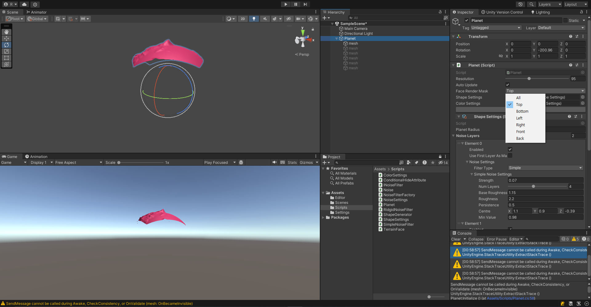 해상도가 높아지면 NoiseSettings의 값들을 조금만 바꿔도 렌더링하는데 매우 오랜 시간이 걸린다. 한 번에 하나의 면만 렌더링하는 옵션을 행성에 추가해보자.